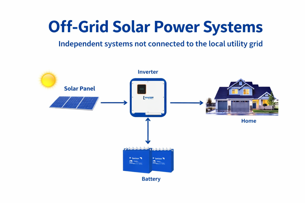 This type of solar setup provides complete energy independence, making it ideal for remote areas, farms, cabins, and mobile homes.