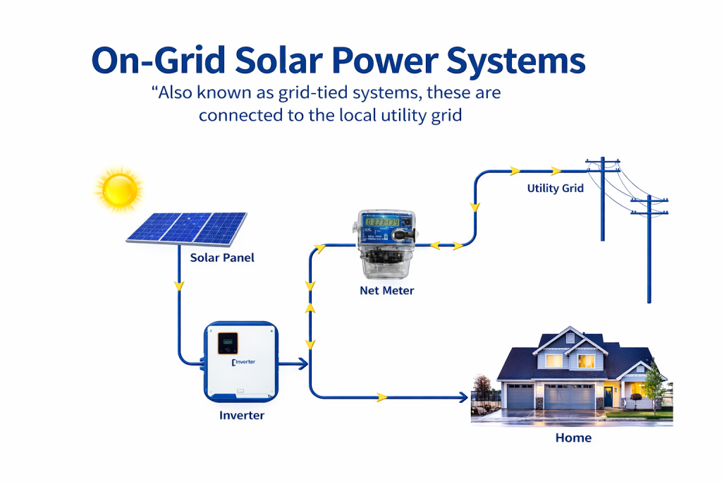 An on-grid solar system, also known as a grid-tied solar system, is connected to the local electricity grid. The solar panels generate electricity during the day, which powers your home appliances.